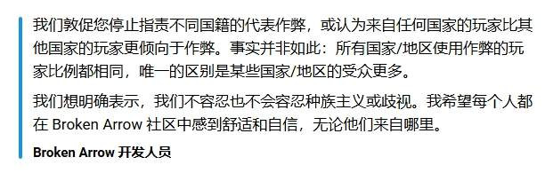 到底发生了什么?故事的起因,还得从游戏官方的区别对待说起。作为占据《断箭》玩家数量最多的中国地区,游戏里老外非常容易撞上我们;而且他们大多不是我们的对手。于是乎老外们跑到官方游戏社区,一边发布歧视言论,一边控诉中国玩家作弊。更过分的是,官方看似表面呼吁停止争吵,实际上反手封禁一批又一批中国玩家账号。