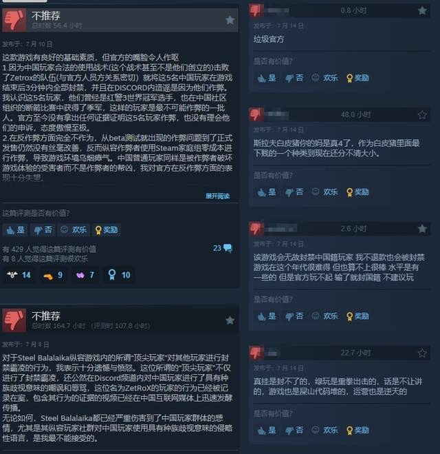 我们仅用5天时间,就把《断箭》的好评打了下来。超过2000条的中文评论,几乎剑指游戏官方不作为,那毫无底线的反外挂方式,竟然是封禁中国玩家账号。游戏官方更是在社区内拱火转移玩家视线,纵容其他玩家挑衅中国玩家引起社区乱战。